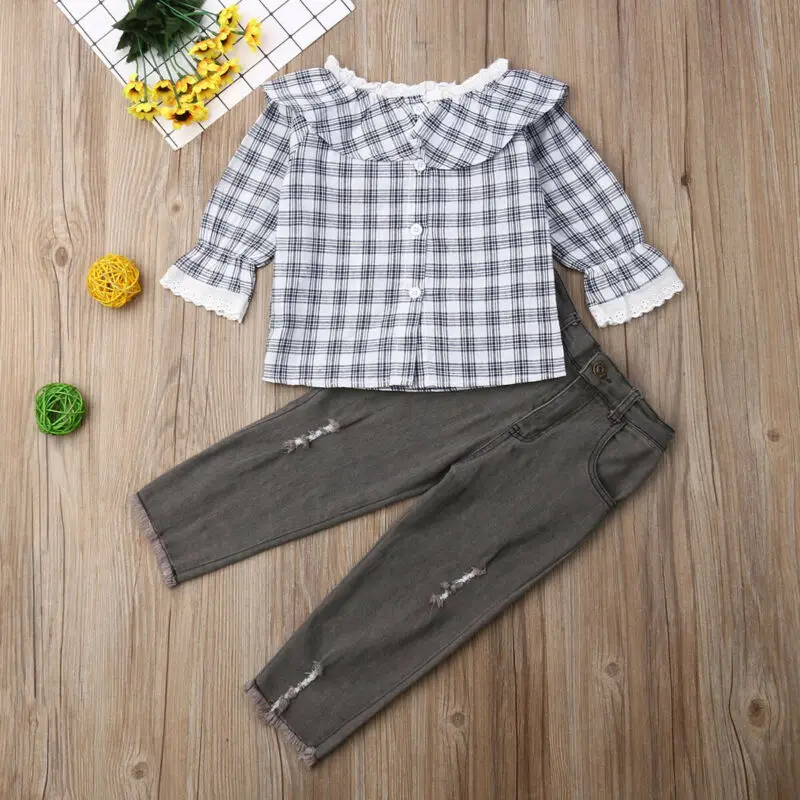 Cheap Chance of 2-7T Toddler Kid Baby Girl Children Autumn Clothes Sets Plaid Long Sleeve Tops Long Pants Jeans 2pc