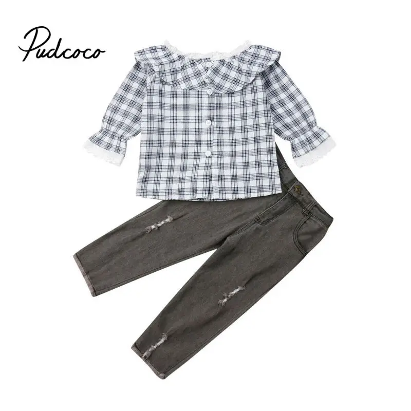 Best Price of 2-7T Toddler Kid Baby Girl Children Autumn Clothes Sets Plaid Long Sleeve Tops Long Pants Jeans 2pc