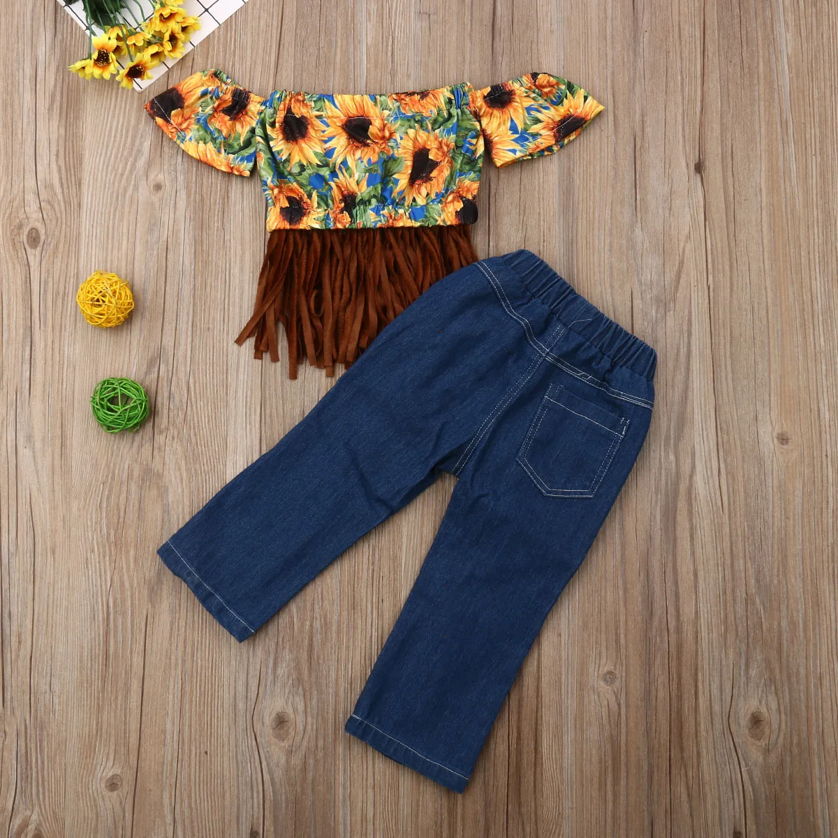 Best Offer for Fashion Summer Toddler Baby Girl Yellow Causal off-shoulder Clothes Sunflower Tassel Tops Crop Ripp